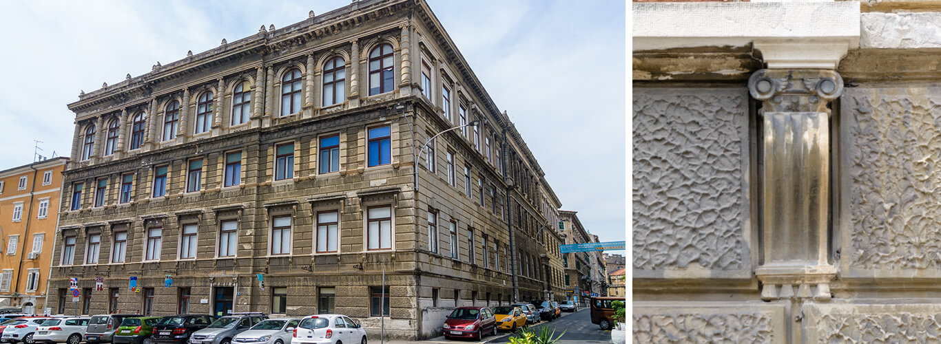 Ženska osmogodišnja građanska škola izgrađena je 1887. prema projektu arhitekta Giaccoma Zamattija. Prema njegovoj ideji, a zbog visinske razlike u razini zemljišta, zgrada je sa sjeverne strane dvokatnica s visokim prizemljem, a s istočne i zapadne trokatnica. Giovanni Rubinich promjenama 1902. zgradi daje današnji izgled, produljivši ju za pet prozorskih osi. Zgradu karakteriziraju tri vidljiva pročelja s dva ulazna portala i sedamnaest prozorskih osi na sj ...