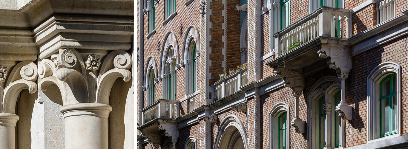 The building façade was built with a combination red brick and stone, representing a blend of Romanesque and Gothic style in architecture of north Italian origin, which can be seen in some elements like the two-light mullioned windows, cornices of the blind arcades, balcony stone fence, animal consoles and gargoyles, as well as wrought iron chandeliers and the rib-groin vault of the loggia in the interior. The central, narrow part of the façade is a bit indented and emphasized by three balcony openings in the form of a three-light mullioned windows, placed one above the other. The internal rooms are divided into residential and business rooms.